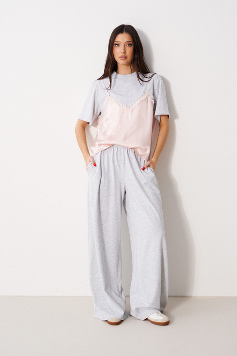 Брюки прямого, свободного кроя выполнены из трикотажного полотна серого цвета. Характеристики: прямой крой, пояс на резинке, в боковых швах карманы. Длина брюк 109 см