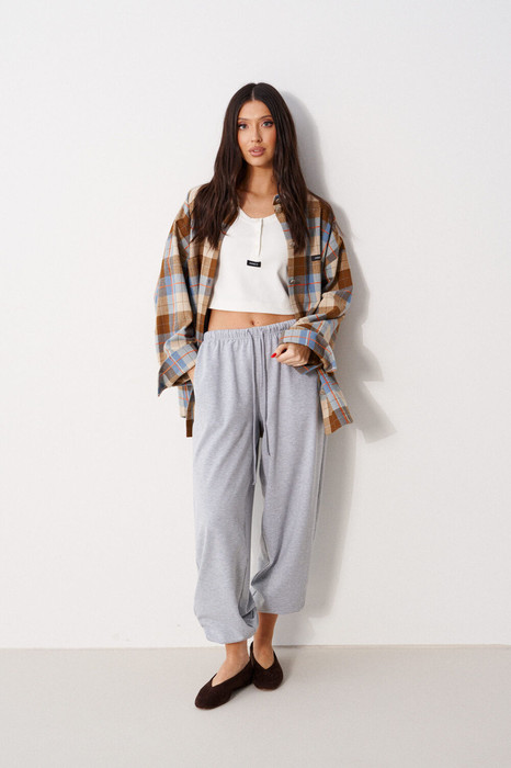 Брюки свободного кроя. Выполнены из хлопковой трикотажной ткани серого цвета. Пояс на резинке, со шнурочком-завязкой. В боковых швах карманы. По задней части накладные карманы. Низ брючины на резинке (не регулируется). Длина 107 см