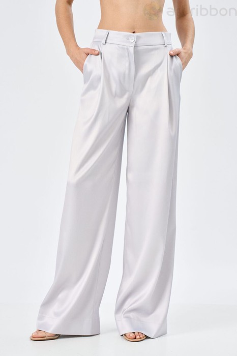Серые атласные брюки-палаццо свободного силуэта с карманами - это не просто одежда, это ощущение свободы и элегантности. Пояс, притачной и идеально сидящий на талии, подчеркивает изгибы фигуры, не сковывая движений. Застежка на центральную тесьму-молнию - классическое и надежное решение, которое обеспечивает комфортное надевание и снятие. Молния скрыта под аккуратной планкой, что придает брюкам завершенный и утонченный вид. Карманы, расположенные по бокам, не только функциональны, но и добавляют изюминку дизайну. Возможно отличие фотографии по оттенку, связанное с разной цветопередачей монитора.