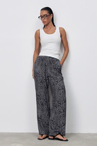 Брюки женские из гладкокрашенного трикотажного полотна «лининг» прямого кроя, длинные, свободные, расширенные к низу, на поясе с эластичной тесьмой внутри, карманами в боковых швах. Передние половины застрочены двумя параллельными линиями, смещенными к боковым швам.