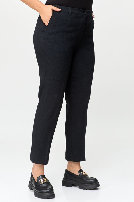 Брюки классические, из плотной текстильной ткани, прямые, слегка заужены к низу, заутюжены стрелки, по переду обработаны карманы с отрезным бочком, застежка на тесьму-молнию и 1 пуговицу. На задних половинках обработаны вытачки и имитация карманов в рамку с двумя обтачками, пояс в брюках притачной, с резинкой. По низу брюк в боковом шве есть небольшой разрез. Длина брюк от талии по боковому шву 96 см