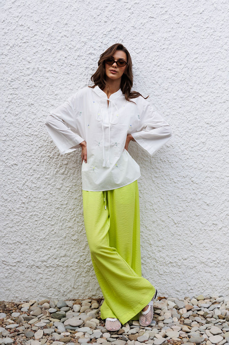 Брюки, немного расширенные к низу, на притачном, отстроченном поясе на резинке со шлевками, в которые втянут шнурок из основной ткани с наконечниками. По переду карманы в боковых швах с наклонным входом.