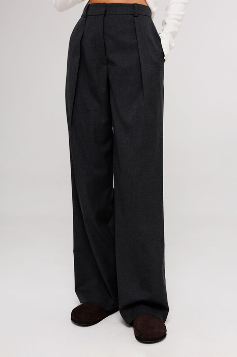 Брюки прямого силуэта на притачном поясе со шлевками и застежкой-гульфик. Пояс застегивается на крючок и потайную петлю-пуговицу. Перед со складкой и заутюженной стрелкой от складки по всей длине брюк и карманами в боковых швах с наклонным входом. Спинка с вытачкой от пояса и заутюженной стрелкой по все длине брюк.