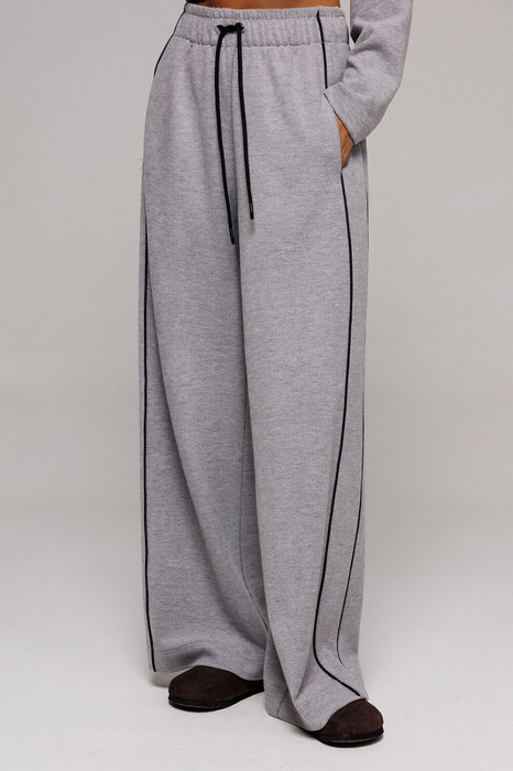 Брюки из трикотажного полотна с велюровым эффектом прямого силуэта на цельнокроеном отстроченном поясе со вставленной в него резинкой и декоративным шнурком. По бокам отрезной бочок с кантом и карманом в шве притачивания бочка.