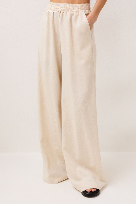 Брюки немного расширенные к низу, на притачном, отстроченном поясе на резинке, с карманами в боковых швах. Вверху по переду имитация застежки-гульфик.