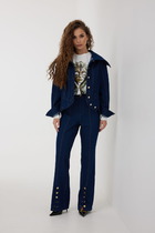 Брюки зауженные к низу на притачном отстроченном поясе. По переду имитация гульфика и карманом-листочкой от бокового шва.