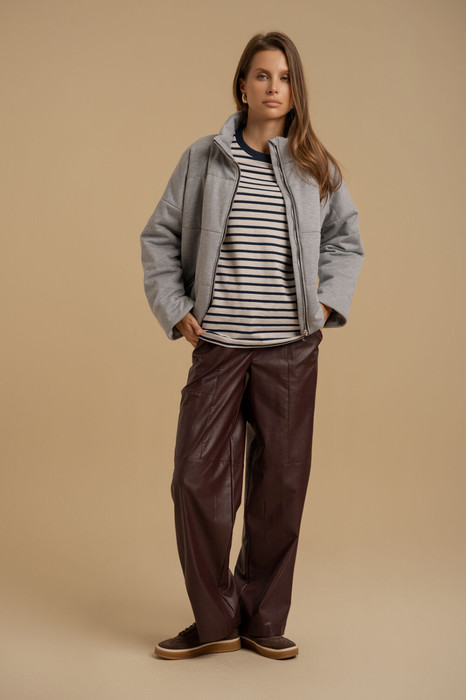 Брюки женские прямого силуэта из искусственной кожи на хлопковой основе. Пояс - отрезной с эластичной тесьмой и застежкой на брючный крючок. В боковых швах - карманы с отрезными бочками. Изделие декорировано подрезами. Есть шлевки для ремня.