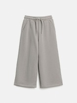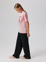 Брюки для девочки из трикотажного полотна "футер-двунитка", на притачном поясе с эластичной тесьмой внутри, с карманами в боковых швах и отделочными деталями фигурной формы на передних половинах. Нижние срезы брюк обработаны с эластичной тесьмой. По швам притачивания отделочных деталей, декоративных вставок и карманам настрочены отделочные строчки. На правой передней половине брюк ниже уровня колена настрочен декоративный элемент прямоугольной формы. Через две петли в центре пояса продет шнурок, позволяющий регулировать степень прилегания изделия по талии.