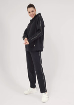 Брюки палаццо с притачным поясом из мягкой вельветовой ткани. Спереди застежка гульфик на молнии и петлей и пуговицей по поясу. По задней частям брюк вытачки. Пояс с резинкой в боковых частях. Брюки с заутюженными стрелками. Длина брюк с учетом пояса - 109 см.