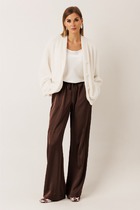 Брюки без пояса, расширенные к низу, по внутреннему срезу верхнего края расположена резинка. По переднему и заднему полотнищу брюк- талиевые вытачки. По талиевым вытачкам переда- декоративные пуговицы.