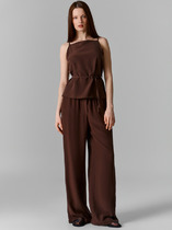 Брюки свободного силуэта слегка заужены к низу. Пояс притачной, частично на эластичной тесьме, с застежкой на петлю и пробивную пуговицу. По переду обработаны карманы с листочкой и подрезным бочком.