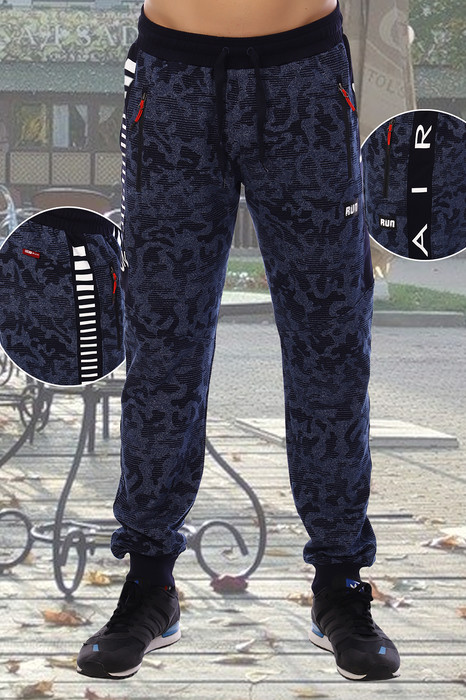 Брюки мужские из футера 2-х нитки в стильной камуфляжной расцветке. Брюки с лампасами, на которых располагается наклейка, нанесенная под высокой температурой, что обеспечивает ей высокое качество. Брюки с карманами, карманы на молнии, на замках брелок. Под карманом также расположена наклейка
