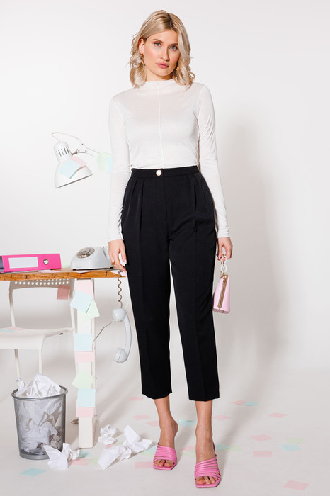 Брюки-бестселлер — зауженные, со стрелками, задающими четкую вертикальную линию, универсальной укороченной длины. Выполнены из смесовой костюмной вискозы с гладкой фактурой. Такую модель можно стилизовать как для вечера, так и для повседневных образов — с изящными босоножками на каблуке или туфлями на плоской подошве.