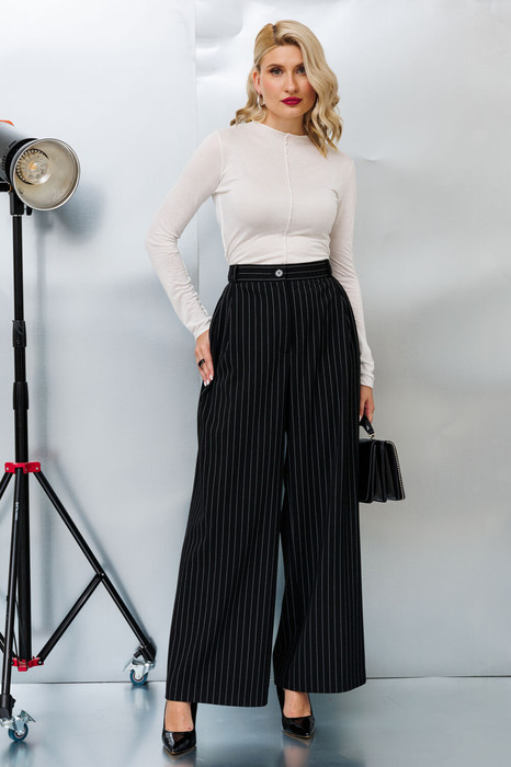 Широкие полосатые брюки. По переду расположены две складки, карманы в боковом шве. Пояс на резинке, для удобства в носке и хорошей посадки. По боковому на поясе расположены паты с декоративной пуговицей. Застежка по переду на брючную молнию. Идеальные брюки для тех, кто хочет мягкий сбодный образ. В комплекте идет пояс с жемчугом.