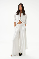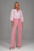 Брюки прямого силуэта из трикотажного полотна. По верху брюк притачной пояс на резинке. На передних половинках брюк обработаны карманы и защипы. На задних – карманы. По низу внешнего шва брюк шлицы.