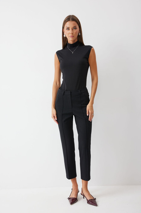 Укороченные брюки прилегающего силуэта из трикотажного полотна. По верху притачной пояс с застежкой и шлевками для ремня. На передних половинках обработаны карманы, защипы и застежка молния в среднем шве. На задних половинках кокетка и защипы. По низу в боковых швах потайные молнии. Обращаем ваше внимание, что фурнитура может отличаться от фото.