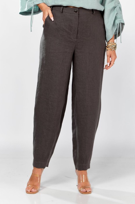 Брюки женские.Спереди застёжка на молнию и пуговицу.Сзади вытачки. В боковых швах карманы с отрезным бочком.Пояс по спинке на резинке , дополнен шлёвками.По низу брюк вытачки, создающие зауженный эффект.