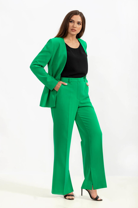 Брюки женские с высокой посадкой, прямые, на притачном поясе и боковыми карманами, выполнены из однотонной ткани. На задних половинках брюк талевые вытачки и имитация карманов в рамку. Застёжка молния с откоском в серединном шве передней части изделия. Пояс застёгивается на крючок.