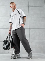 Брюки мужские из трикотажного полотна "лининг" свободного покроя, со смещенными к центрам передних половин боковыми швами, карманами в боковых швах и притачным поясом с эластичной тесьмой внутри. Нижние срезы обработаны подгибкой с эластичной тесьмой. Для регулирования степени прилегания изделия по талии предусмотрен шнурок, вставленный через две обметанные петли в центре пояса спереди.