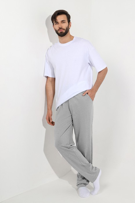 Брюки мужские из меланжированного трикотажного полотна "кулирка", прямого силуэта, с карманами в боковых швах, на притачном поясе с эластичной тесьмой внутри. В центре пояса - две обметанные петли , через которые продет шнурок для регулирования степени прилегания шорт по талии.