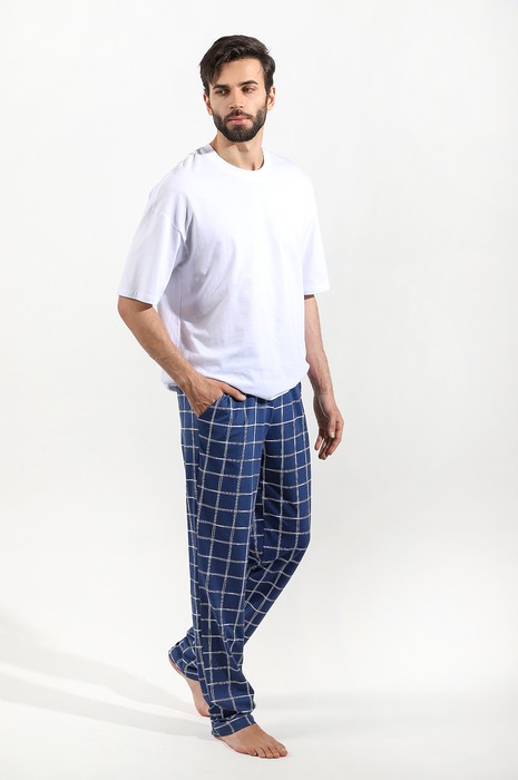 Брюки из полотна с набивным рисунком, классического покроя, прямые, на притачном поясе с эластичной тесьмой внутри, с карманами в боковых швах. Входы в карманы окантованы основным материалом.