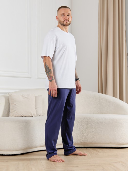 Брюки мужские из гладкокрашенго трикотажного полотна "кулирная гладь", свободного покроя, на притачном поясе с эластичной тесьмой внутри, с карманами в боковых швах. Нижние срезы обработаны подгибкой.