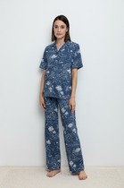 Брюки женские из тканого полотна «искусственный шёлк полиэстер» с набивным рисунком, длинные, свободные, с карманами в боковых швах, на притачном поясе с эластичной тесьмой внутри.