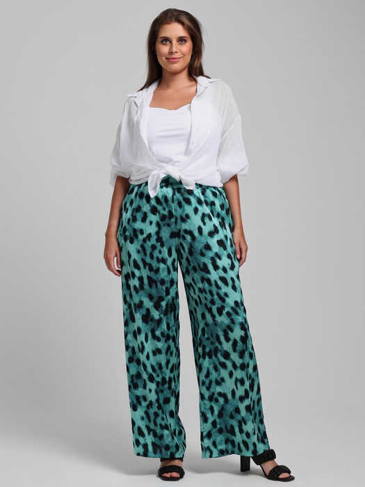 Брюки женские из тканого полотна «искусственный шёлк полиэстер» с набивным рисунком, длинные, свободные, с карманами в боковых швах, на притачном поясе с эластичной тесьмой внутри.