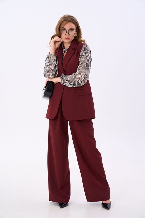 Элегантные брюки прямого кроя с боковыми карманами с отрезным бочком. Застежка на молнию и пуговицу. По переду - складки. Задние половинки с талиевыми вытачками и прорезными карманами с листочкой. Верхний срез обработан притачным поясом, по спинке собран на резинку. Низ обработан швом в подгибку.