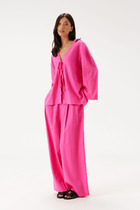 Брюки средней посадки из мягкого трикотажа. В пояс вставлена резинка с регулируемым шнурком. В боковых швах карманы.