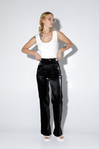Текстильные брюки-палаццо с высокой посадкой. Детали: высокая посадка, широкие и длинные брюки, притачной пояс со шлевками, передние половины с небольшими застроченными мягкими складками и заутюженными стрелками, застежка на молнию и пуговицу, боковые карманы