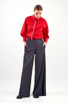 Текстильные брюки-палаццо с высокой посадкой. Детали: высокая посадка, широкие и длинные брюки, притачной пояс со шлевками, передние половины с небольшими застроченными мягкими складками и заутюженными стрелками, застежка на молнию и пуговицу, боковые карманы