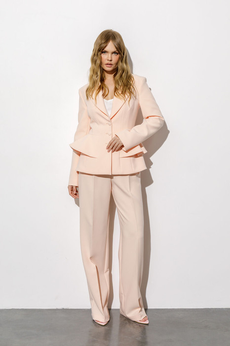 Детали: высокая посадка, притачной пояс со шлевками, передние половины с небольшими застроченными мягкими складками и заутюженными стрелками, застежка на молнию и пуговицу, боковые карманы. Задние части брюк с вытачками и заутюженными стрелками. Пояс брюк прямой, без резинки.