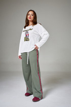 Детали: брюки с притачным поясом со шлевками, передние половины с застроченными мягкими складками и заутюженными стрелками, застежка на молнию и пуговицу, боковые карманы. Задние части брюк с вытачками и заутюженными стрелками. Пояс брюк без резинки.