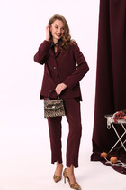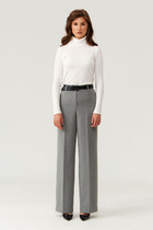 Детали: притачной пояс со шлевками, передние половины с заутюженными стрелками, застежка на молнию и потайные крючки, боковые карманы. Задние части брюк с вытачками и заутюженными стрелками. Пояс брюк без резинки.