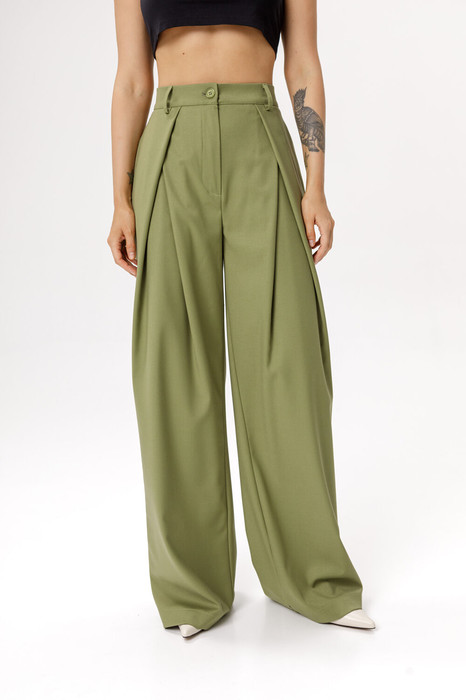 Детали: широкие брюки с притачным поясом со шлёвками, задняя часть пояса на резинке, карманы в боковых швах, застёжка на молнию и пуговицу, задняя часть брюк с вытачками.