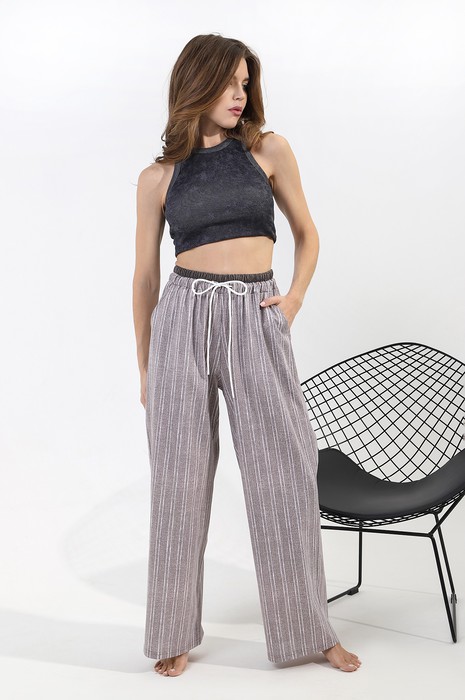 Брюки - молодежные из трикотажного полотна «кулирка» с набивным рисунком «полоска», длинные, свободные, на притачном поясе с эластичной тесьмой внутри, выполненным из двух видов ткани: с набивным рисунком и гладкокрашеной. В пояс вставлен декоративный шнурок, продетый через две обметанные петли в центре пояса.