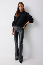 Модель свободного кроя, к низу чуть заужена, на эластичном поясе, со шлёвками. В кулису на поясе вставлен шнурок с наконечниками. Спереди прорезные карманы с листочкой. Сзади накладные карманы. По низу брюк застрочены вытачки. Ширина по низу регулируется резинкой и фиксаторами, создавая разный силуэт.