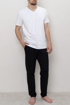 Брюки мужские на манжете, пояс в два цвета. Изделие с карманами на молнии, на молниях висит брелок, под левым карманом наклейка-печать. У правого кармана надпись-наклейка. Брюки со шнурком