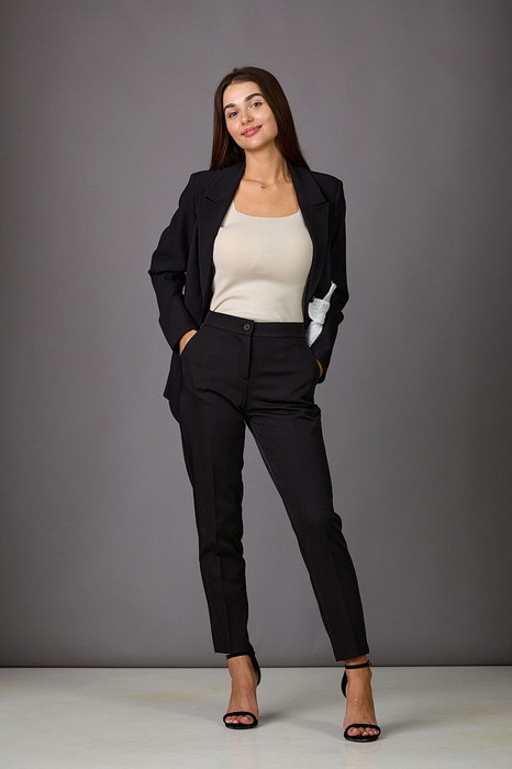 Брюки женские из костюмной ткани. Посадка- средняя. Слегка заужены к низу, с наклонными карманами и регулируемым резинкой поясом. Застегиааются на молнию по переду и одну пуговицу.