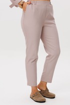 Брюки женские из трикотажной ткани (двунитка), слегка заужены к низу. По переду брюк расположены накладные карманы. На левом кармане настрочной декоративный элемент. В пояс вставлена резинка по кругу.