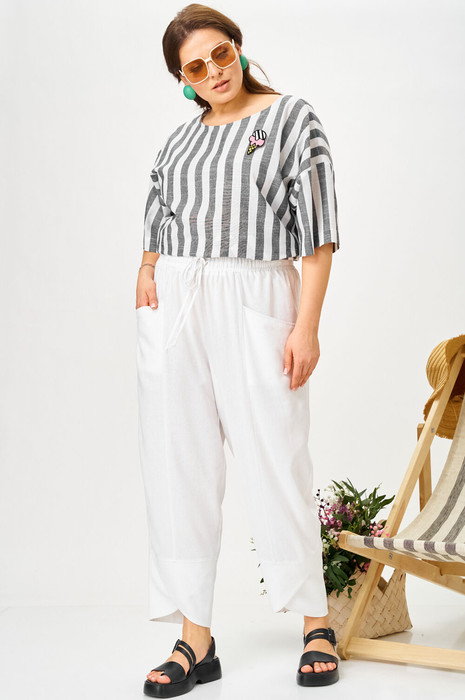 Брюки свободные в посадке с круговой резинкой по поясу, шнурок в поясе позволит дополнительно скорректировать посадку по высоте. Функциональные карманы. Низ брюк на фигурной обтачке придает интересность и легкость, ножку делает более утонченной.