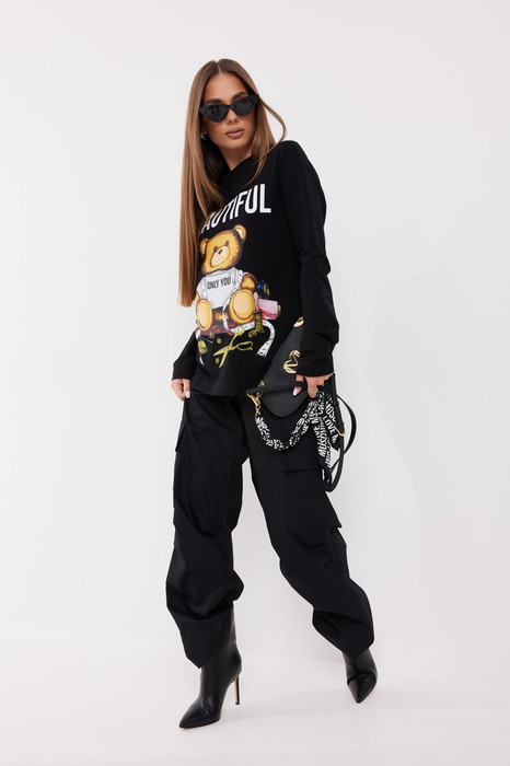 Брюки-карго прямые, свободной формы. Верх на притачном поясе со шлёвками. Застёжка на поясе на кнопку. В пояс по  спинке вставлена  резинка.  Застёжка на молнию. По переду накладные  карманы. По бокам накладные карманы с клапаном.  По переду складки в области колена.