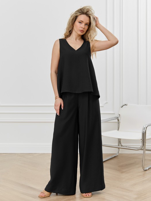 Брюки женские из гладкокрашеного фактурного полотна длинные, широкие по всей длине, на притачном поясе с эластичной тесьмой внутри, с карманами в боковых швах. Модным элементом является широкая подгибка нижних срезов.