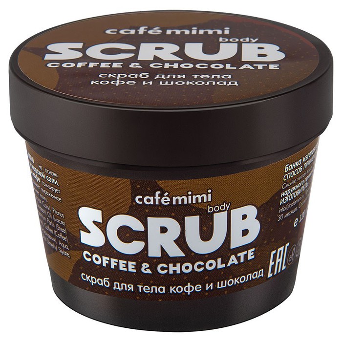 Скраб для тела Кофе и Шоколад на основе натурального молотого кофе, тростникового сахара и морской соли, который эффективно отшелушивает и очищает кожу.