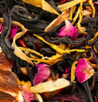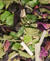 Ярко выраженное восточное благоухание зелёного китайского крупнолистового чая дополняется за счет кусочков спелых плодов ананаса, приправленных соцветиями мальвы, сафлора, красной розы и календулы.