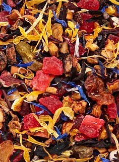 СОСТАВ: Каркаде резанный, цукаты папайя, цукаты ананаса, лепестки василька, календула, кожура шиповника, кусочки сушеного яблока, изюм. Содержит пищевые ароматические масла.Фруктово-цветочная смесь успокаивает нервную систему и восстанавливает эмоциональное равновесие. Вкусный и ароматный напиток идеально подходит для вечернего чаепития.
