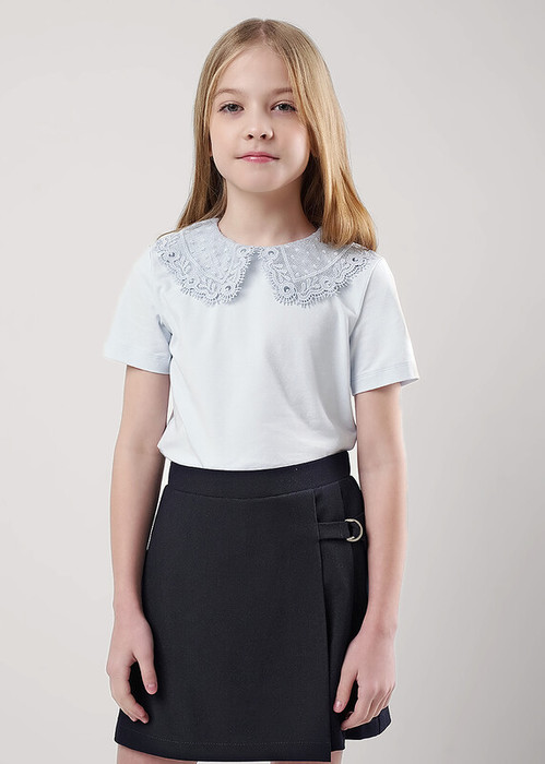 Базовая блузка с ажурным воротничком станет отличным дополнением к вашему гардеробу! Модель скоротким рукавом выполнена из хлопкового полотна с добавлением эластана. Блузка отлично подойдет для создания классных школьных образов!