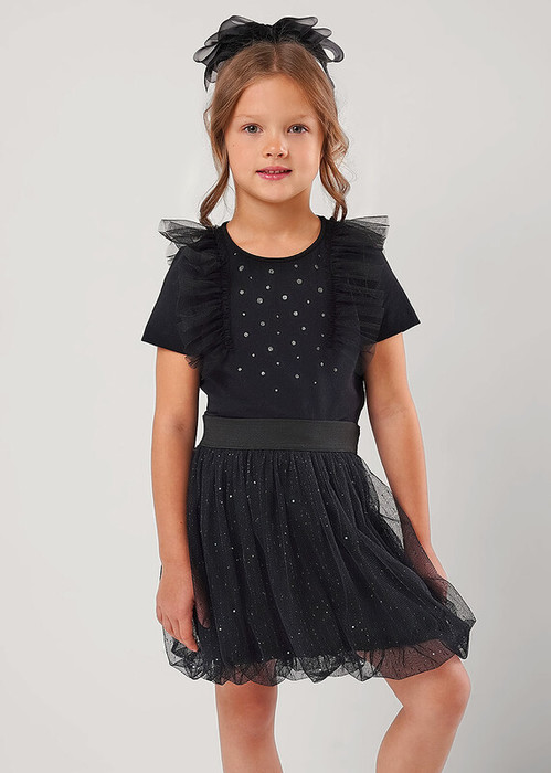 Нарядная блузка с рукавами крылышками из сетки, украшенная стразами. Выполнена из хлопкового трикотажа с эластаном. Такая модель легко впишется в любой праздничный образ.