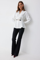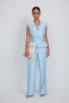 Брюки прямые,широкие из текстильного полотна габардин. Притачной пояс со шлевками, гульфиком и застежкой на молнию, крючок. Боковые карманы с отрезным бочком. По спинке вытачки и карманы листочка,стрелки.